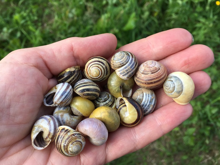 These are all white-lipped snails (Cepaea hortensis). They are also known as banded snails, though they don’t always have bands. The ground color can be yellow, pink or brown. This handful was collected from just a few feet of farm track, which shows how common they are. All are empty of snail though some may be full of bee. (Last week, I learned that the native mason bee Osmia bicolor repurposes empty banded shells as nurseries for her larvae.)