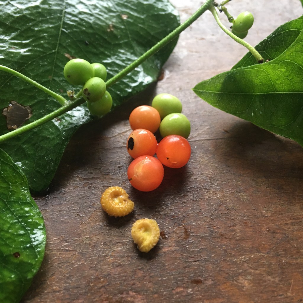 • Carolina Snailseed Find the clumps of berries that start green and mature to orange-red. (Almost the same size as berries of the bad bush honeysuckle.)