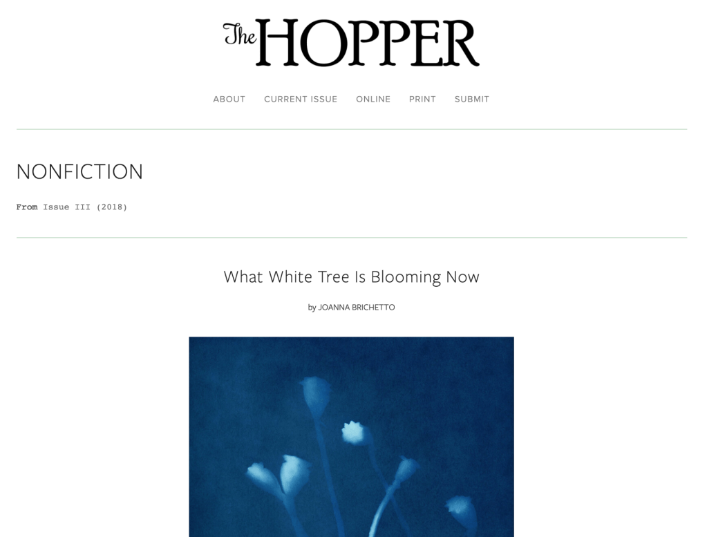 My short, personal essay “What White Tree is Blooming Now” from 2018 has just been archived online, thanks to The Hopper, an environmental literary magazine. And the timing could not be more perfect…
