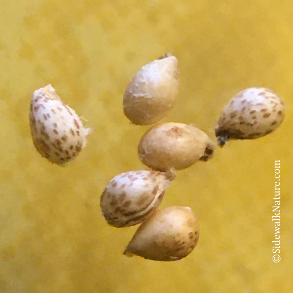 I’ve known this for ages, but never tried to SEE the treat on a violet seed. This time, I took a hand lens to the kitchen table and tried . . . and tried. . . with fresh seeds and older seeds, white and black.