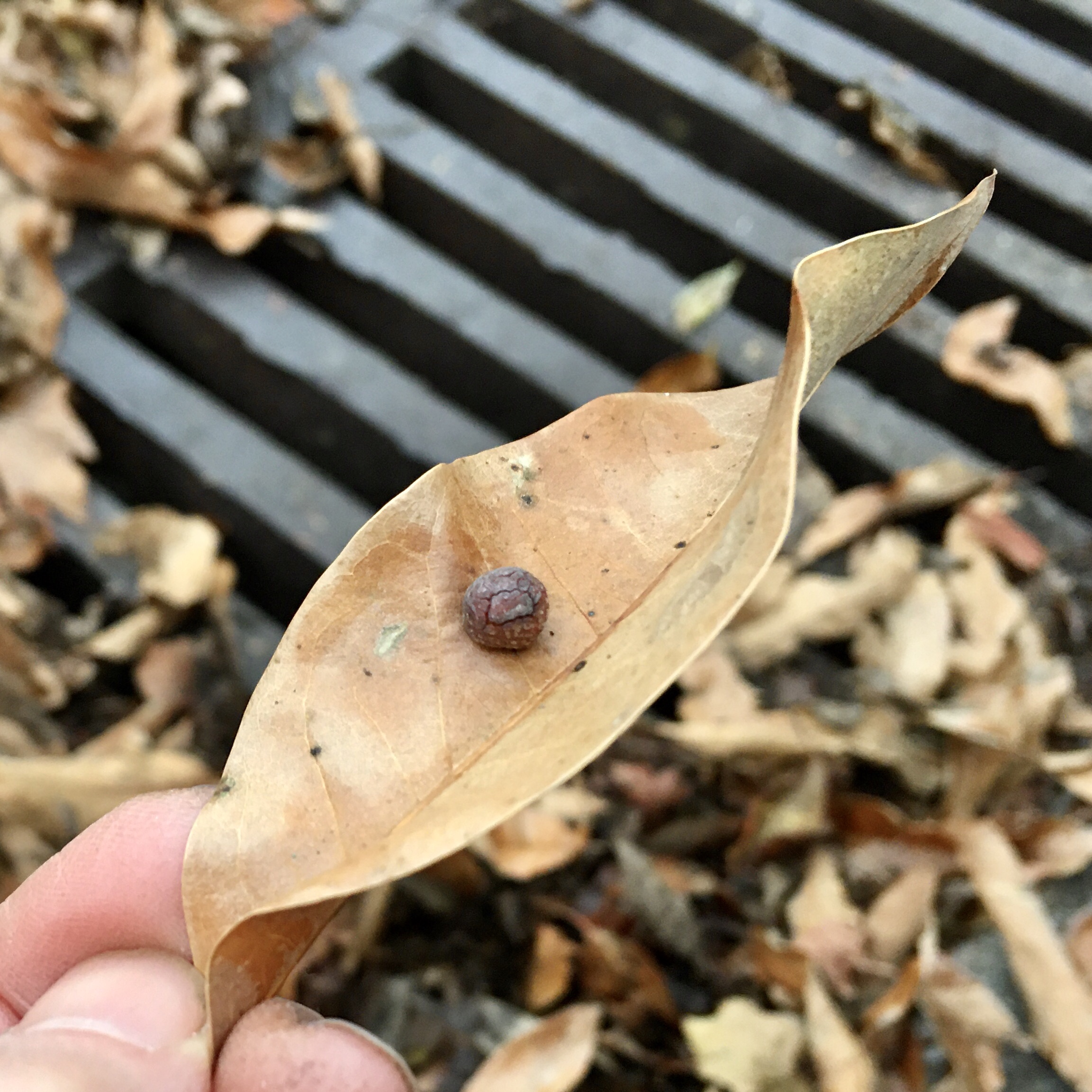 I’ve cleared storm grates of loose leaves (Shingle oak with galls!), I’ve stolen paper bags from the curb (Hackberry with galls!), and I’ve taken 16 plastic Hefty bags from a sidewalk (Black oak with galls!).