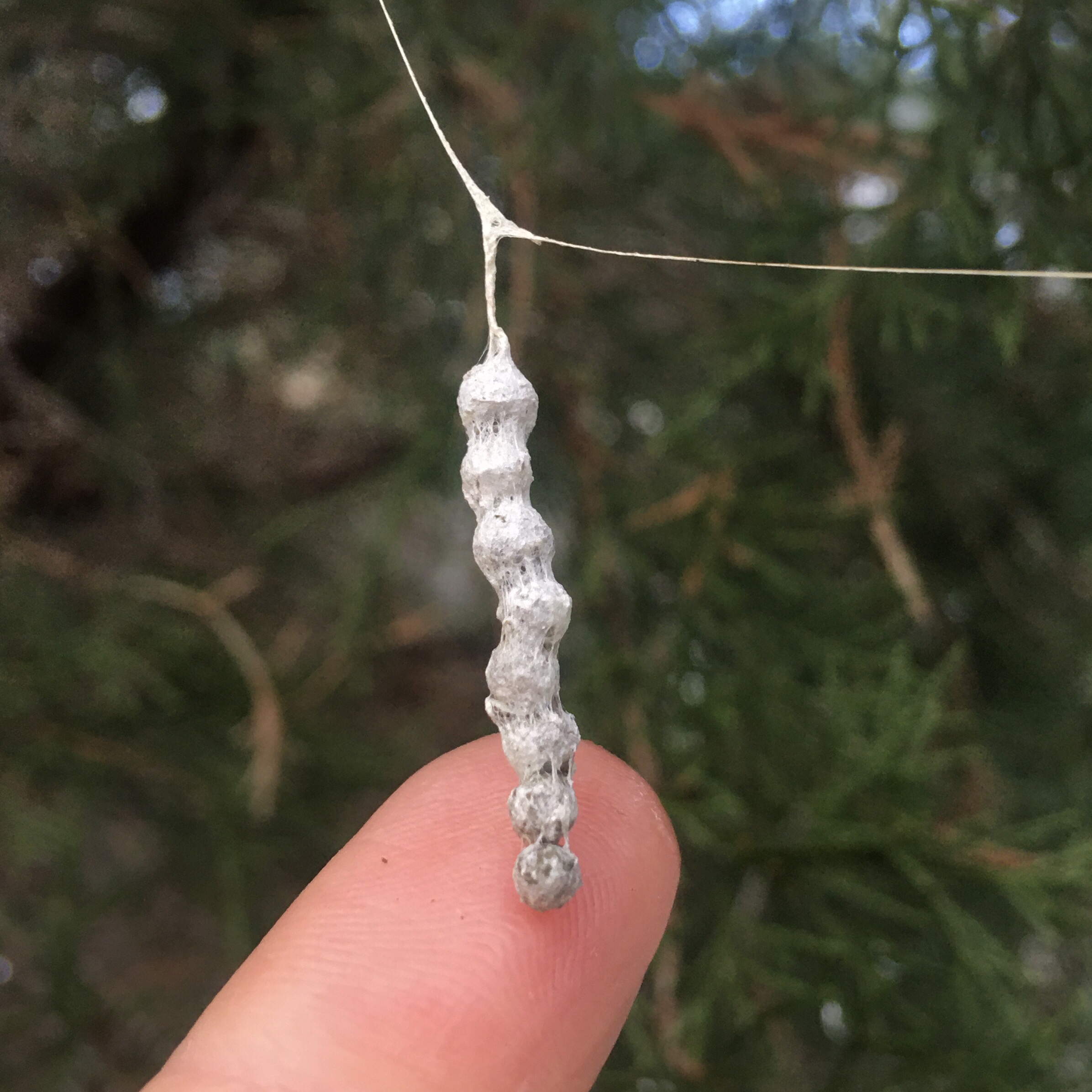 The species name means “hanging ribbons,” but the egg-sacs make me think of Add-a-Pearl necklaces.