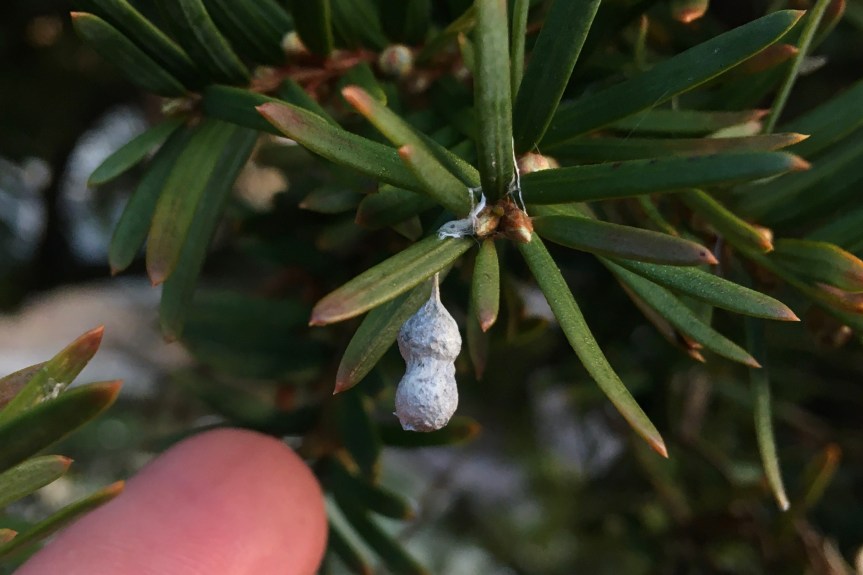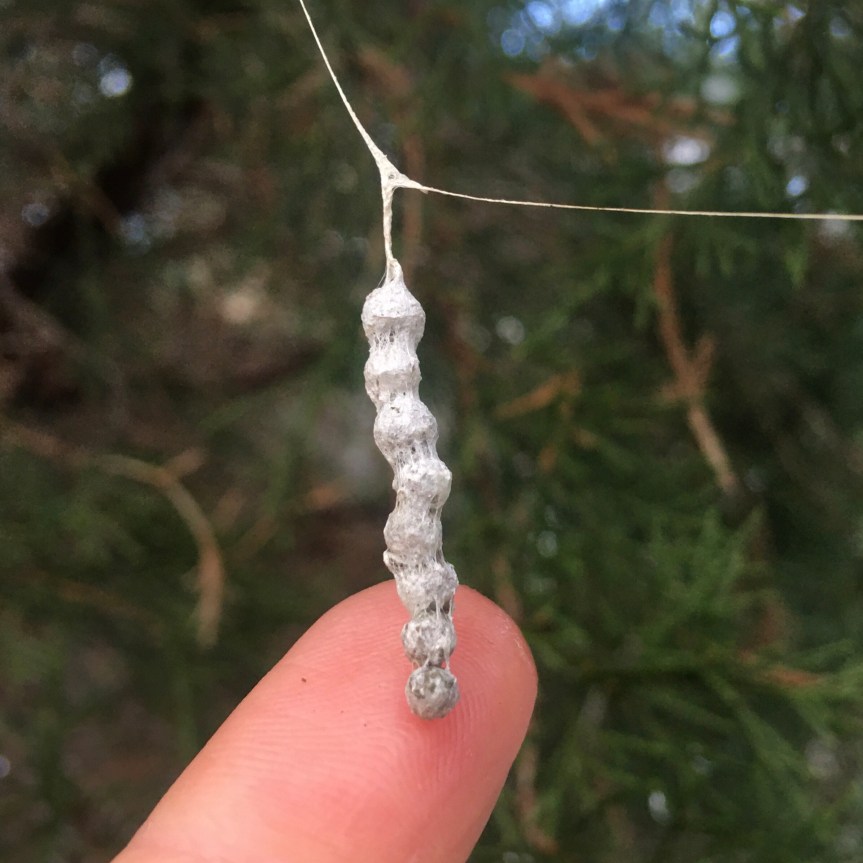 Today’s Sidewalk Nature: a spider-egg necklace in a Yew hedge. There are 1, 2, 3 pearls in this one, but I’ve seen up to eight. The mom spider—a Basilica orbweaver—is always nearby, till the frost gets her.