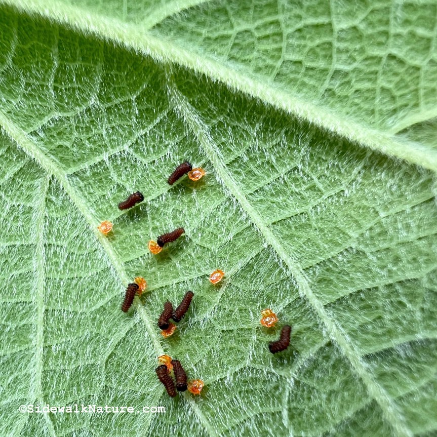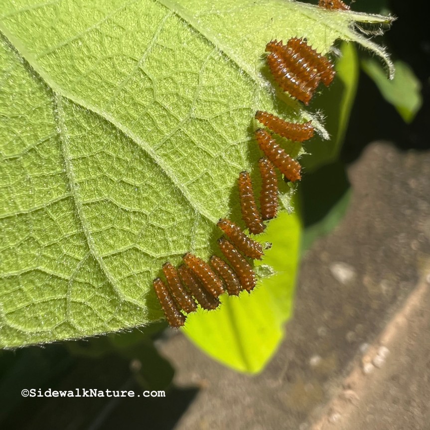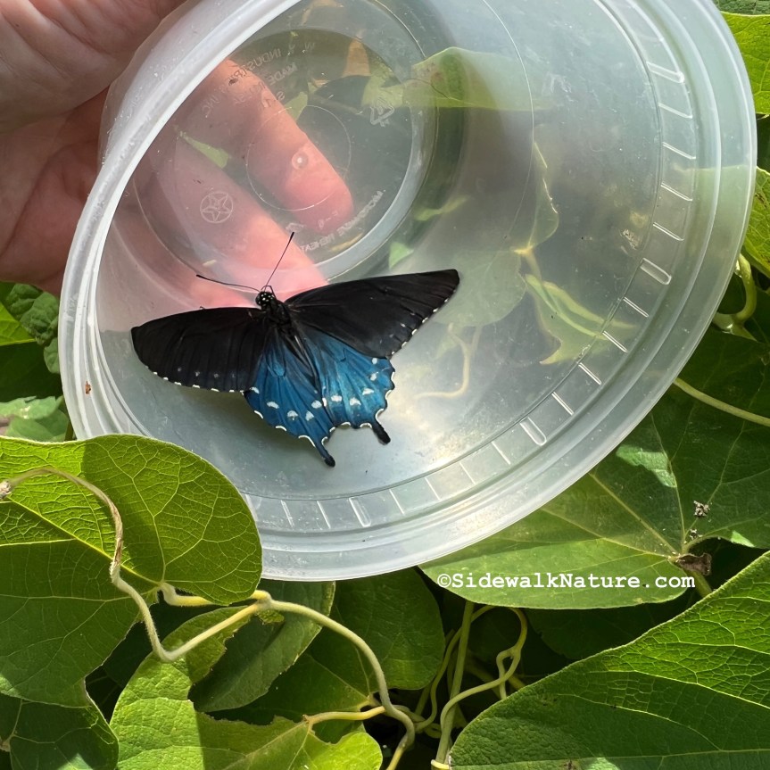 Local Pipevine Swallowtails can use Woolly Pipevine (Aristolochia tomentosa) and Big-leaf Pipevine / Dutchman’s Pipe (A. macrophylla) as host plants. Females search for these plants when time to lay eggs. They lay multiple eggs in one spot, and it is amaaaazing to watch the hatchlings emerge, eat their eggshells, and then start eating the same leaf at the same time.