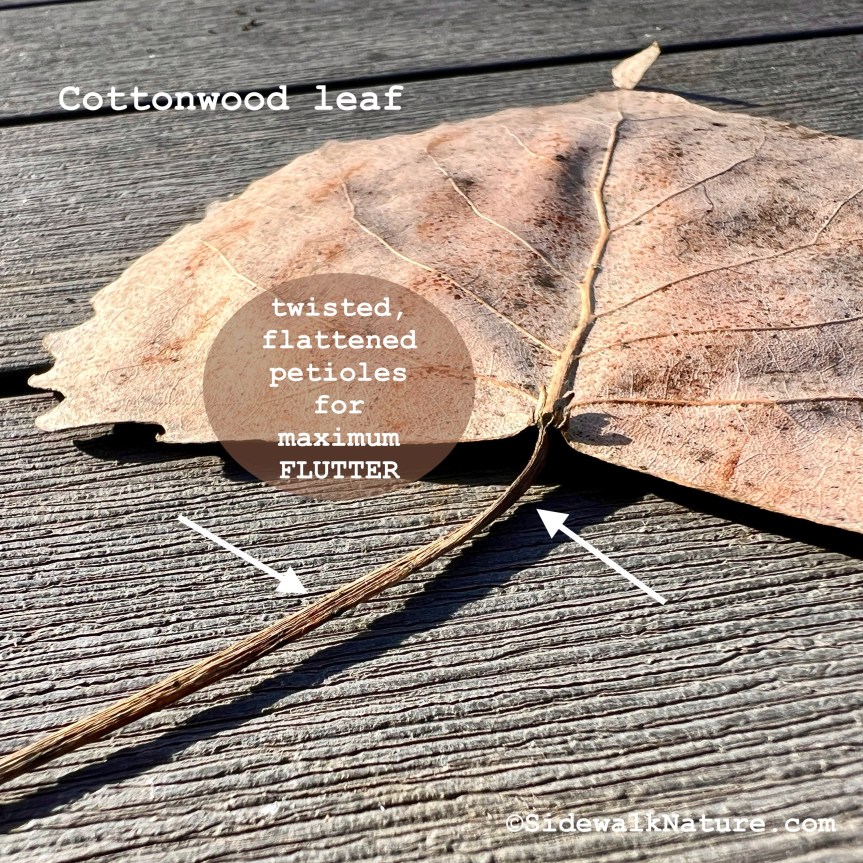 Wait. Please go rub a Cottonwood leaf at the next opportunity. The stem is special. It’s flattened along two planes, and the bit near the leaf is flattened perpendicular to the blade, which makes the leaf flip-flop in the slightest breeze.