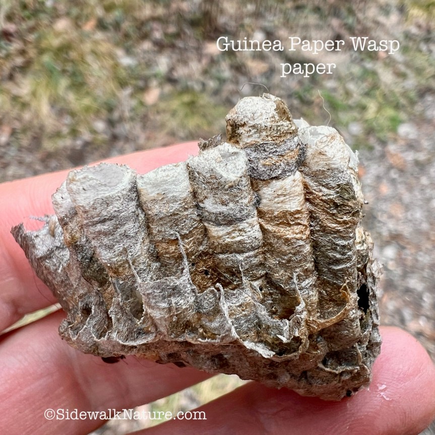 Guinea paper wasps capture caterpillars and other invertebrates to feed their larvae; and the adults eat “nectar and juice from ripe fruit.” They have many predators, large and small. Males can’t sting. Females can, if threatened. So do not threaten.