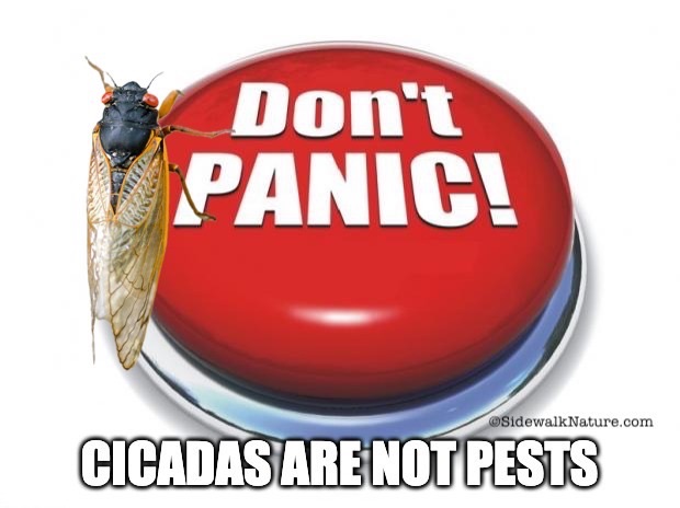 Reason #1: An emergence of periodical cicadas is not an “invasion.” Cicadas are not body snatchers. They aren’t even classified as pests, and they never need pesticides. They don’t eat plants, they don’t bite or sting. They are harmless, native, and weirdly cute bugs just trying to do their thing for a few days every 13 years. Their thing: emerge, fly, sing, mate, lay eggs, die.
