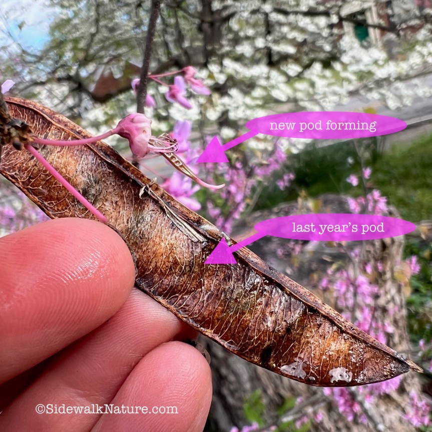 If you’re sad the recent rain knocked flowers off a redbud, look closely to find what’s left on the tree: developing fruit. Those mini pea pods are adorable.