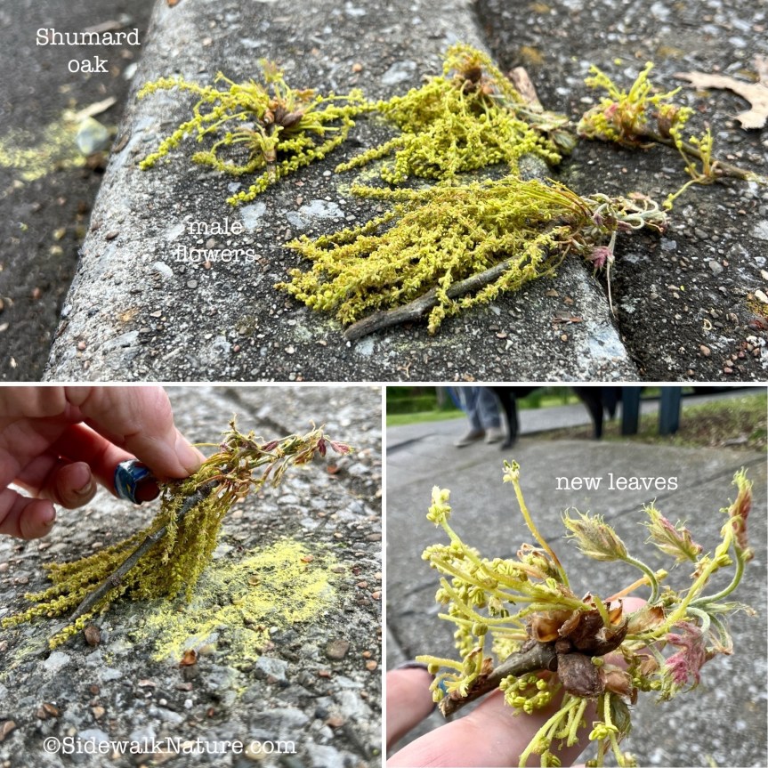 Like these Shumard oak leaves emerging from winter buds along with male catkins. The pollen paints the street yellow!