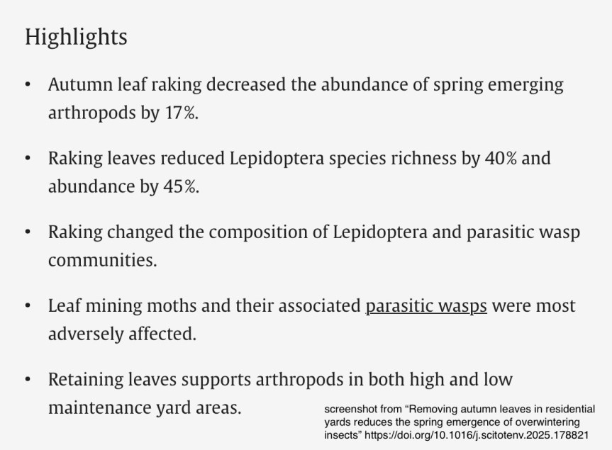 –(the study)”Removing autumn leaves in residential yards reduces the spring emergence of overwintering insects” Max Ferlauto, Karin T. Burghart, Department of Entomology, University of Maryland, College Park, MD 20742, USA https://doi.org/10.1016/j.scitotenv.2025.178821