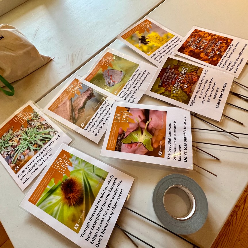 –“Our Habitat Garden” took Xerces graphics and added text to make printable signs for leaf events (link) Our Nature Center laminated them, and I taped them to metal “H” stands to poke in the ground. They can guide people from the welcome table to the action, or they can surround the active space. Reusable every year: