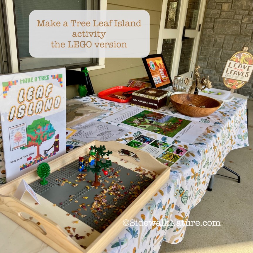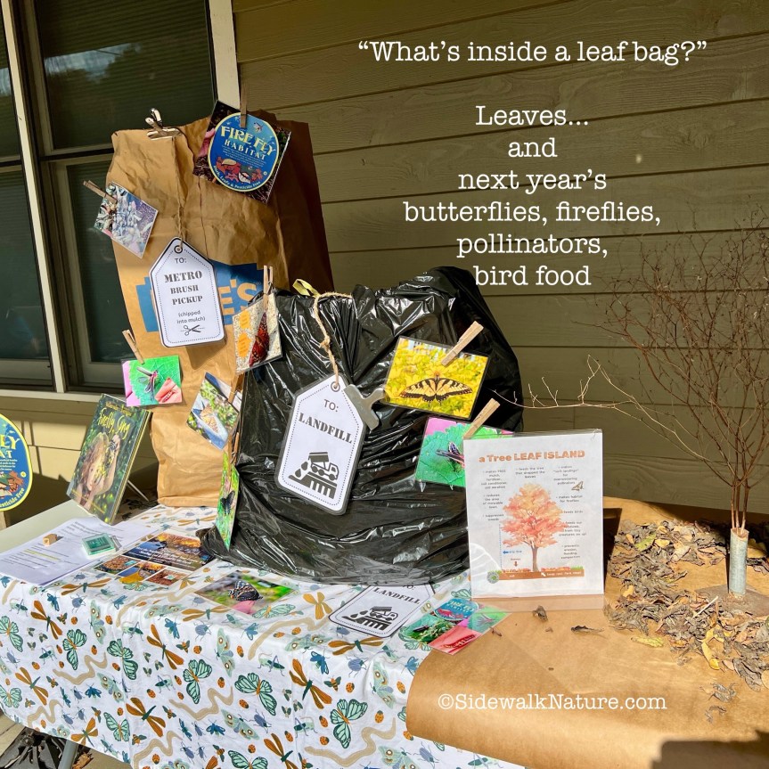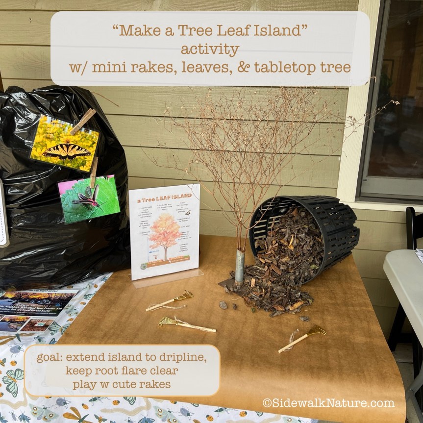 My SidewalkNature display was the plastic and paper bags o’ leaves and critters, but my activity was about WHERE to leave the leaves. So I came up with “Make a Tree Leaf Island.”
