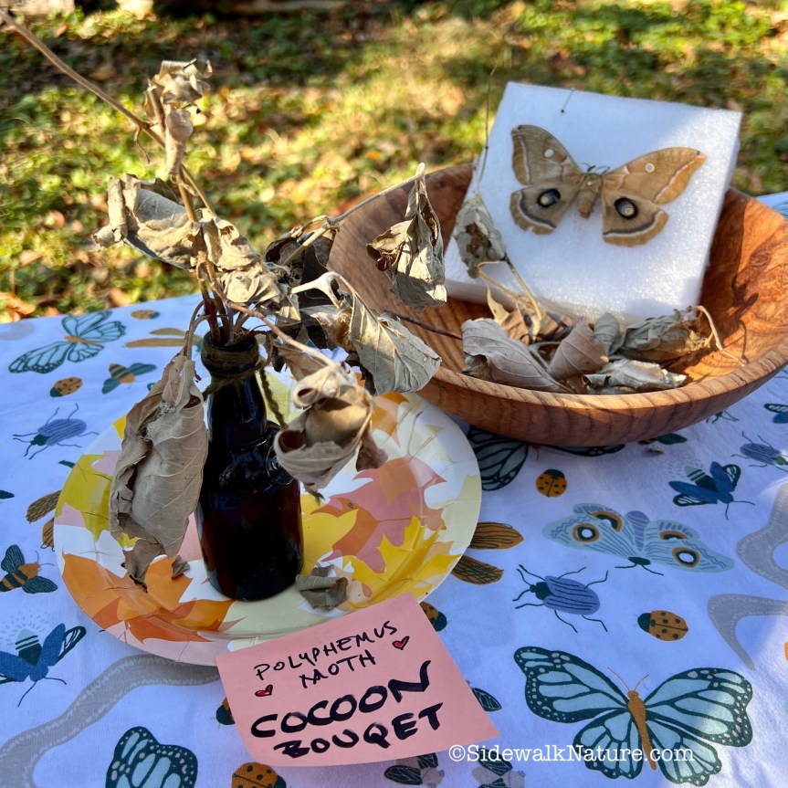 I also brought Polyphemus cocoons that each caterpillar made inside a leaf shelter. Good camouflage from birds, but also apt to get mown, shredded or burned by people who think they’re just leaves: