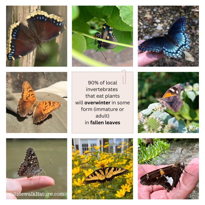 Remember: about 90% of the arthropods in Nashville overwinter in some form—whether egg, larva, pupa, or adult—in, on or under the leaves. Butterflies, lightning bugs, ladybugs, flower-flies, bumble bees, and so on.