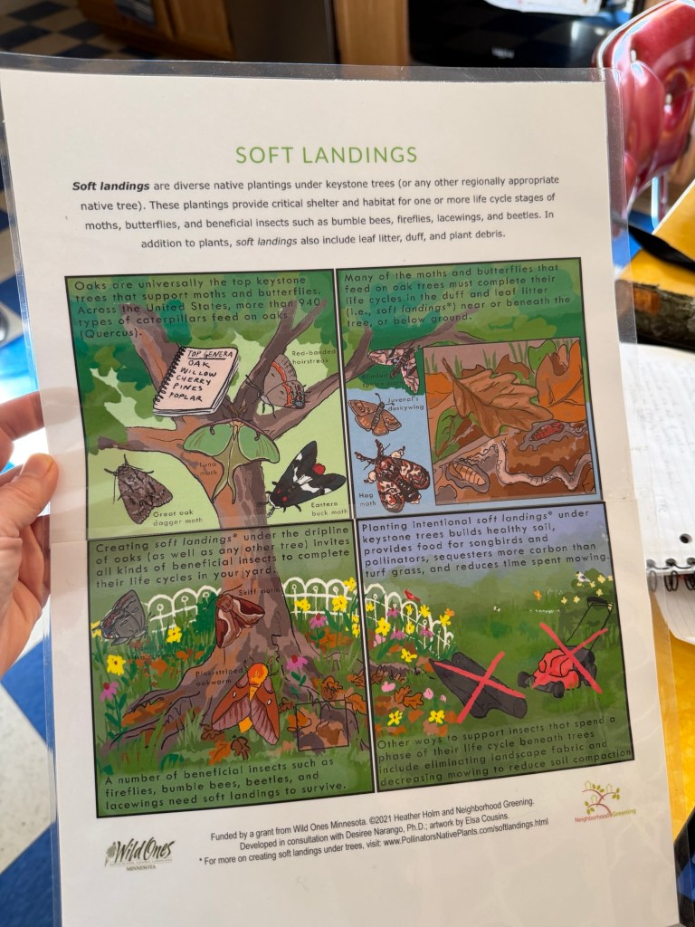 After the under-the-tree piles kills the turfgrass, you can make the area more beneficial by turning it into proper “Soft Landings” a la Heather Holm. At my table, I had her infographic (link below) to show what this means: