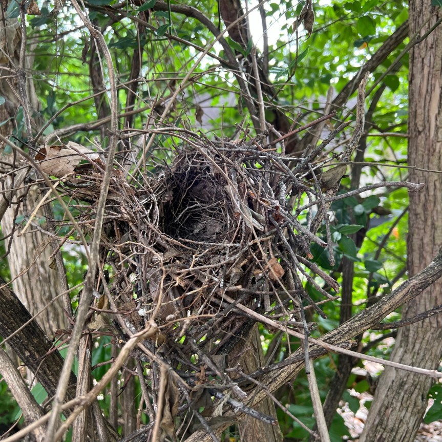 [Brown thrasher nest in the brush pile, after the babies fledged]