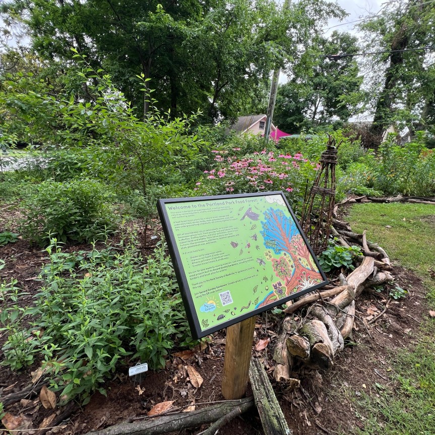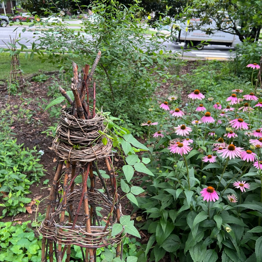 Maureen May, founder of our Second Sunday Gardeners group, reminds us that tree debris can be crafted into beautiful arbors, benches, teepees, trellises and tuteurs. Go see all these in action at Portland Park (address below). And while you’re there, note the branch borders of our Food Forest. Every time SSG gardeners visit to maintain the Pollinator patch or the Food Forest, we pick up sticks to add to the edge. In a truly sustainable property, all “waste” is welcome and put to good use.