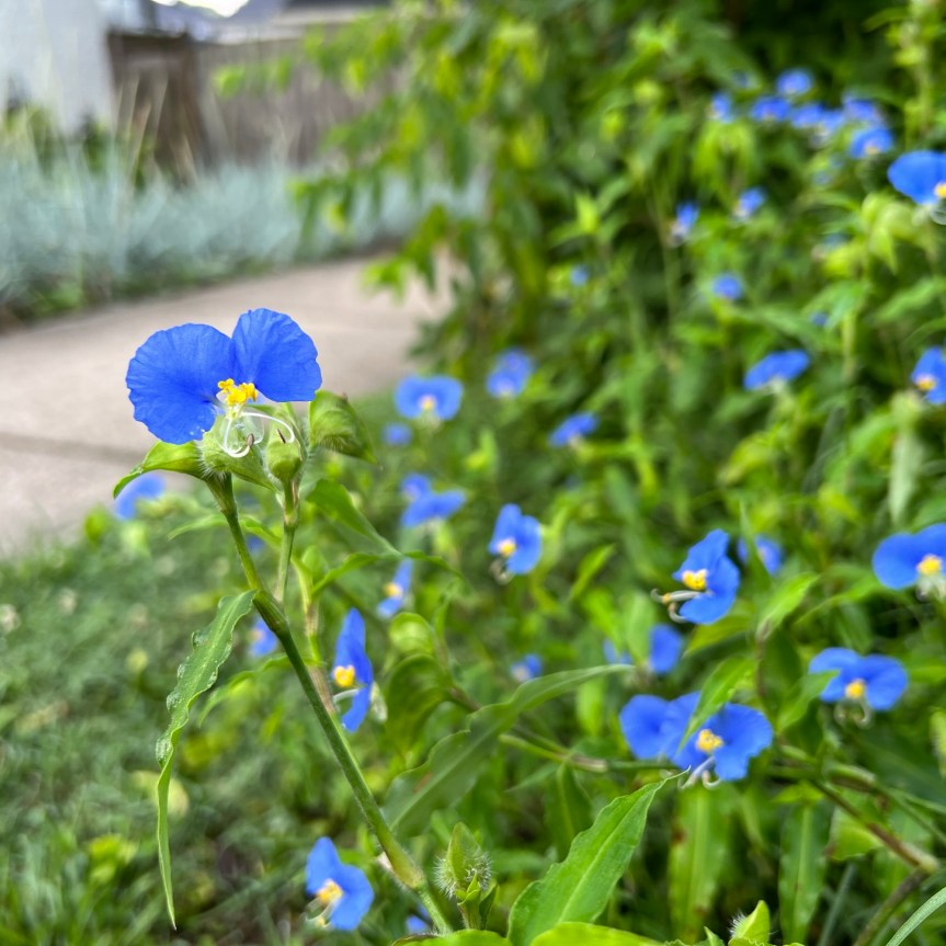 Whitemouth dayflower is true blue. In books, it’s also known as Slender dayflower and Widow’s tears, but none of these names reference what’s so striking about the plant – the clear, bright, beautiful blue – so at our house, it is known as the Blueys: as in “Hey, the Blueys are blooming, come and see.”