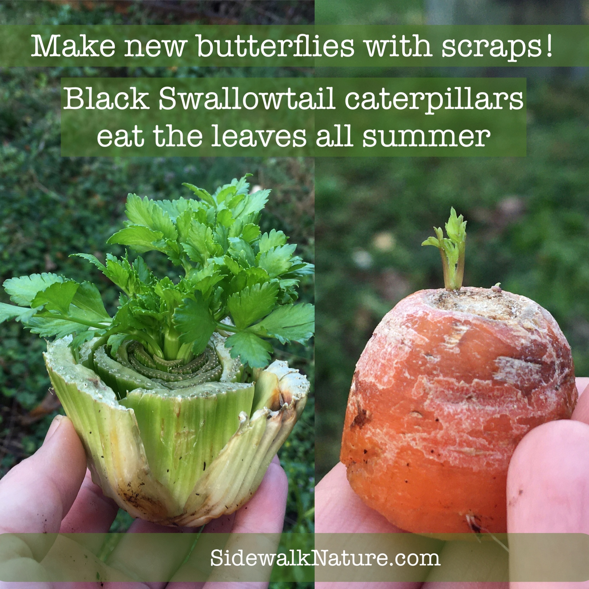 Easiest butterfly garden ever: let celery butts and carrot butts sprout, then stick ’em in soil.
