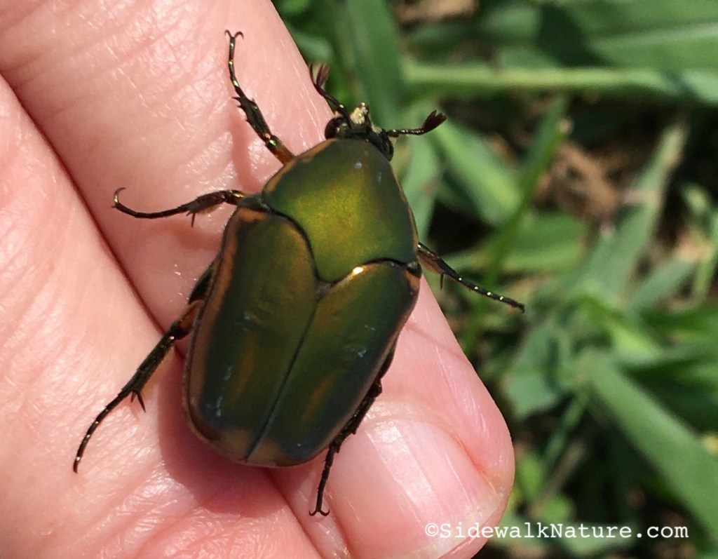 Every year, our neighbor’s treeless lawn proves good for something: June bugs. Hundreds of dark blurs zoom around us in bright sun, just a foot or two above the grass. They fly too fast to ID or catch, but when they land, they’ll crawl on a finger and take a ride.